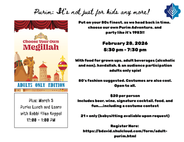 Babysitting is available upon request. Please contact if you will utilize babysitting, please email Rabbi Elisa Koppel. We must receive notification no later than end of day on February 26 so that we can make proper arrangements.