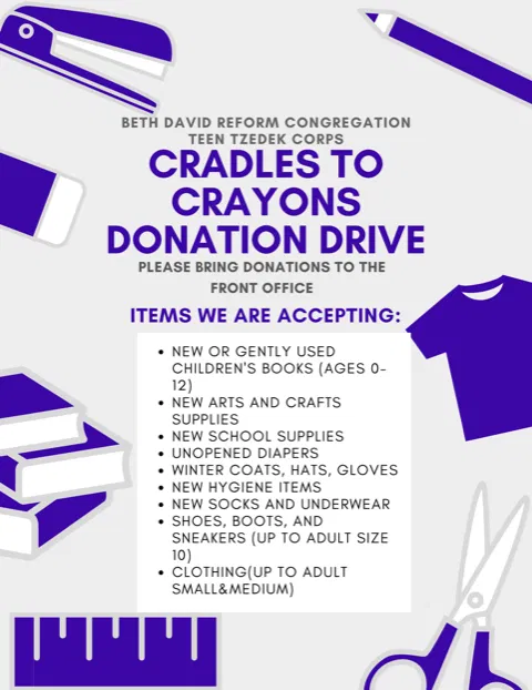 Our Teen Tzedek (the Jewish value of justice) Corps is sponsoring a service project to aid the Cradles to Crayons Philadelphia, an organization driven by a focused and all-important goal: to make life better for children in need. The drive will run through PURIM, March 7. You can place your donations in the grey bin in the Temple Office Lobby. The clothes should ALL be for children. Many thanks.