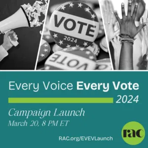Are you ready to get out the vote and start building a democracy that works for everyone? Join Cantor Goodlev and 1000 Reform Jews from across the country on March 20 at 8 PM ET to launch our 2024 Every Voice, Every Vote Campaign! Secure your spot today at RAC.org/EVEVLaunch. In 2024, we must come together once again to make sure that all voters have an equal say in decisions that impact our lives. By following the lead of those most impacted, we will break down the barriers to voting, pass ballot initiatives to advance reproductive freedom and democracy, and ensure that all people, no matter their race, age, background, or zip code, have the freedom to vote.